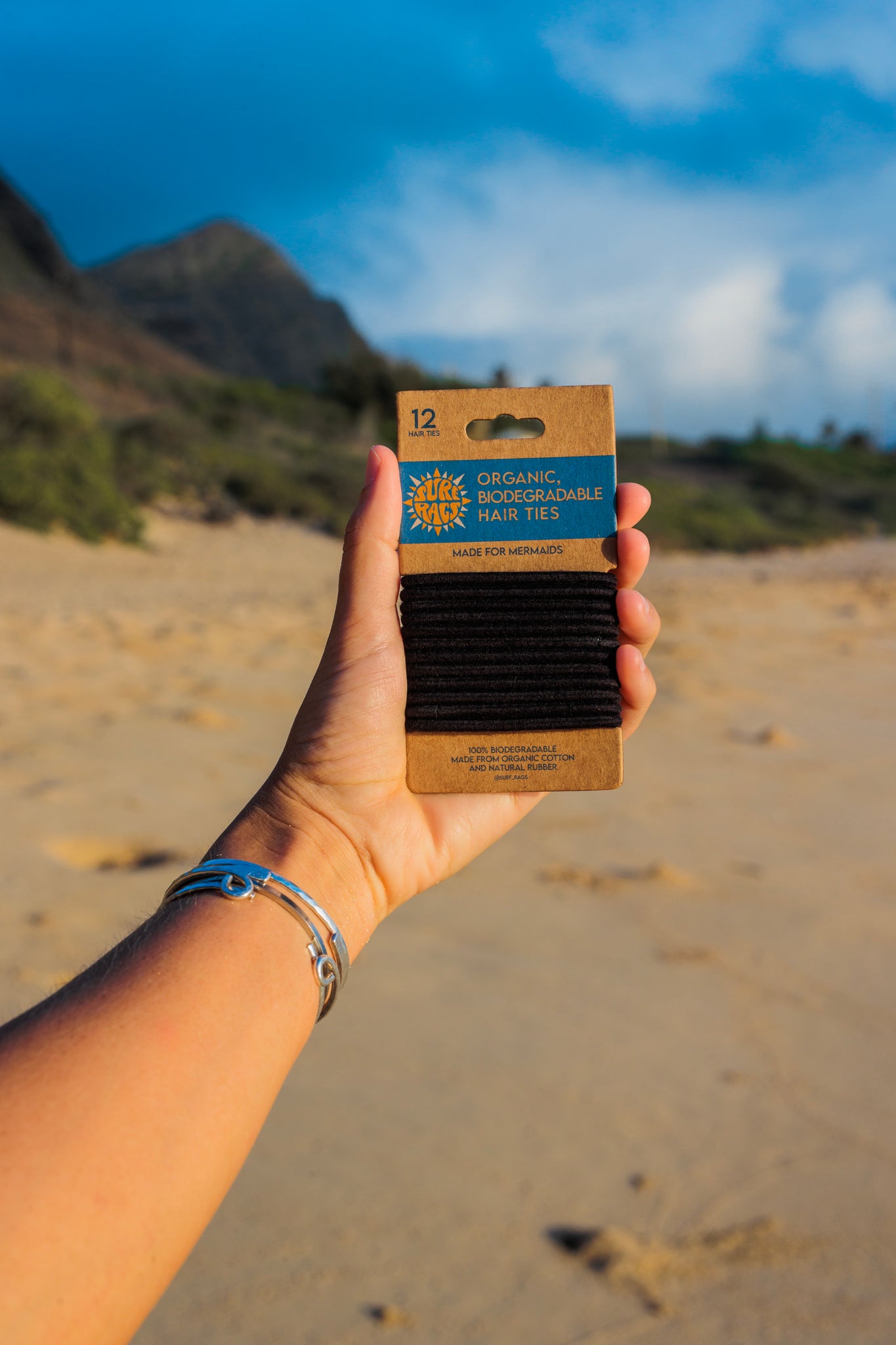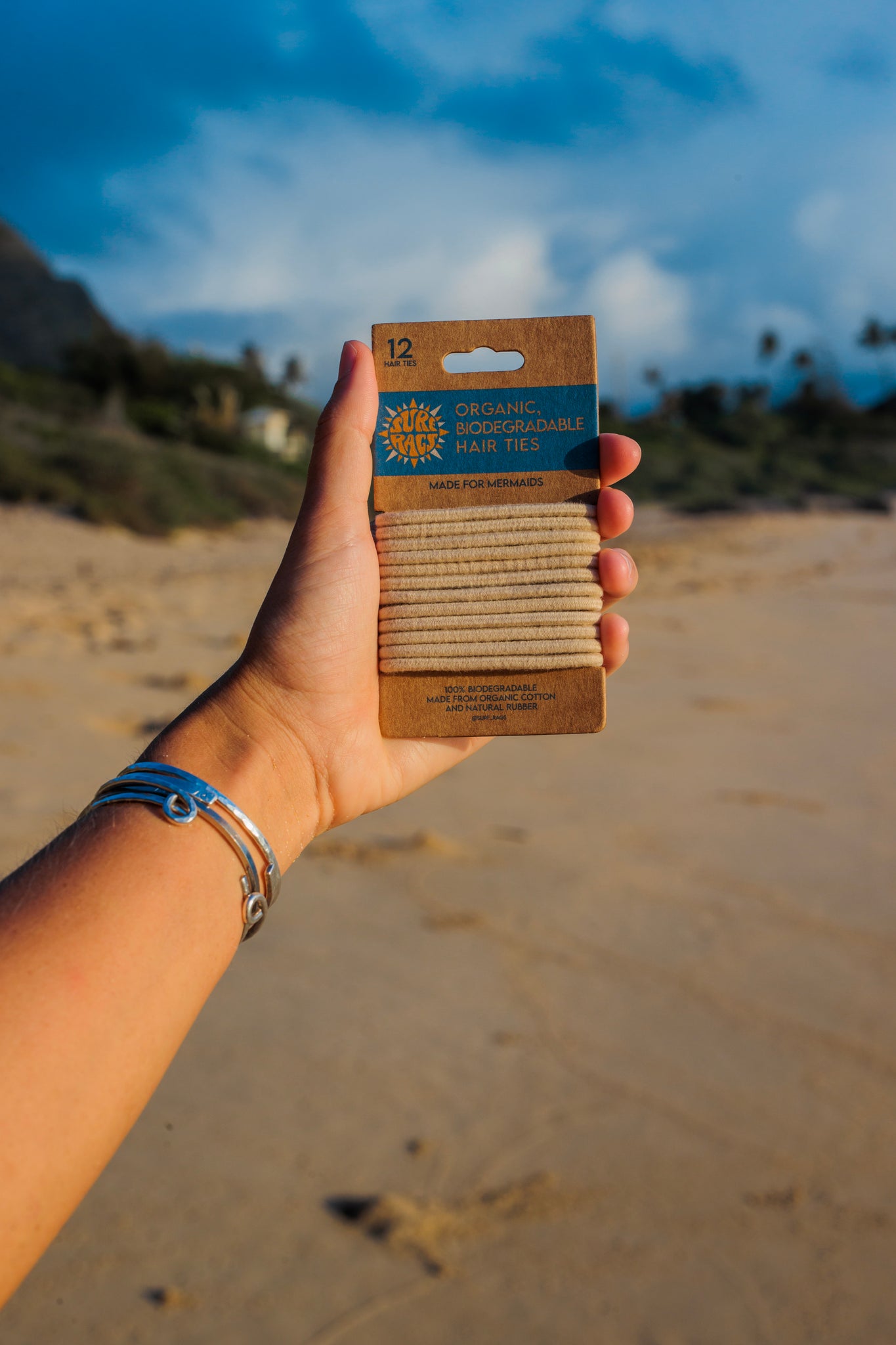 These hair ties are made from natural rubber and cotton, which deteriorate significantly faster than regular synthetic hair ties, but are still strong and sturdy enough to hold the thiccest ponytail or space buns. You should still do your best not to lose them, and to dispose of them properly when they break, but if everyone was using these, maybe I wouldn't be finding hundreds in the ocean every month. Each unit contains 12 hair ties. Currently Shipping!
